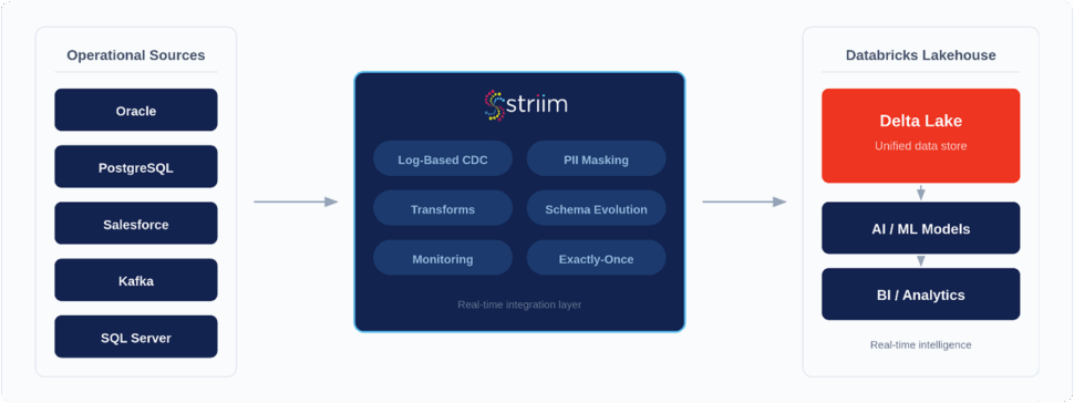 Overcoming these operational challenges requires more than just a pipleine; it requires robust, purpose-built architecture. As the world’s leading Unified Integration & Intelligence Platform, Striim enables enterprises to continuously feed Databricks with the fresh, secure, and highly optimized data required to drive AI and analytics into production.