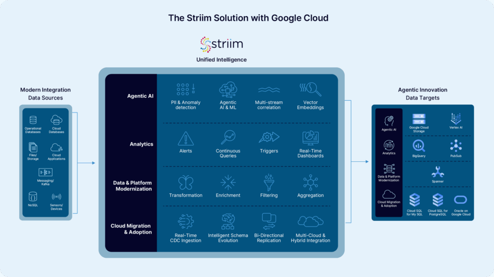 Striim serves as the company’s real-time data integration layer, continuously capturing change data from Oracle, PostgreSQL, and other systems via Change Data Capture (CDC). The data is enriched, transformed, and streamed into Google BigQuery within seconds, making it instantly available for analytics, AI, and operational decision-making.