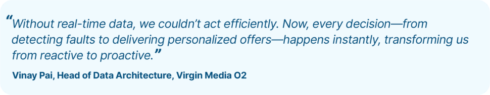 As a newly merged entity with a vast customer base, VMO2 faced challenges with accessibility, volume, and scale. The merger brought together complex, siloed systems across multiple legacy platforms. Batch-based processing limited the company’s ability to deliver timely insights, restricting proactive decision-making and real-time service response.